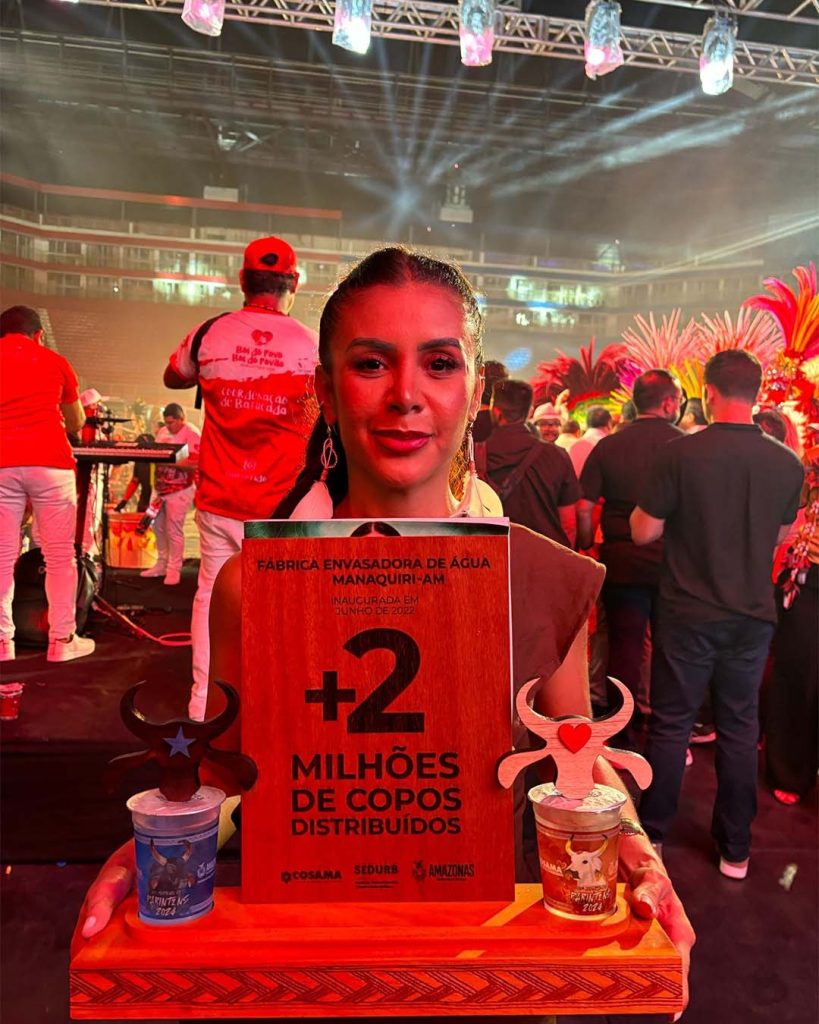 A noite foi marcada pela apresentação da nova identidade visual dos copos, que trazem as cores vibrantes dos bois, além de um momento especial de homenagem ao governador Wilson Lima. Em reconhecimento à continuidade da ação e ao impacto social das doações, ele recebeu um símbolo comemorativo pela marca de mais de 2 milhões de copos distribuídos em Parintins ao longo dos anos, produzidos pela Fábrica Estadual Ensavadora, em diversas ações governamentais.